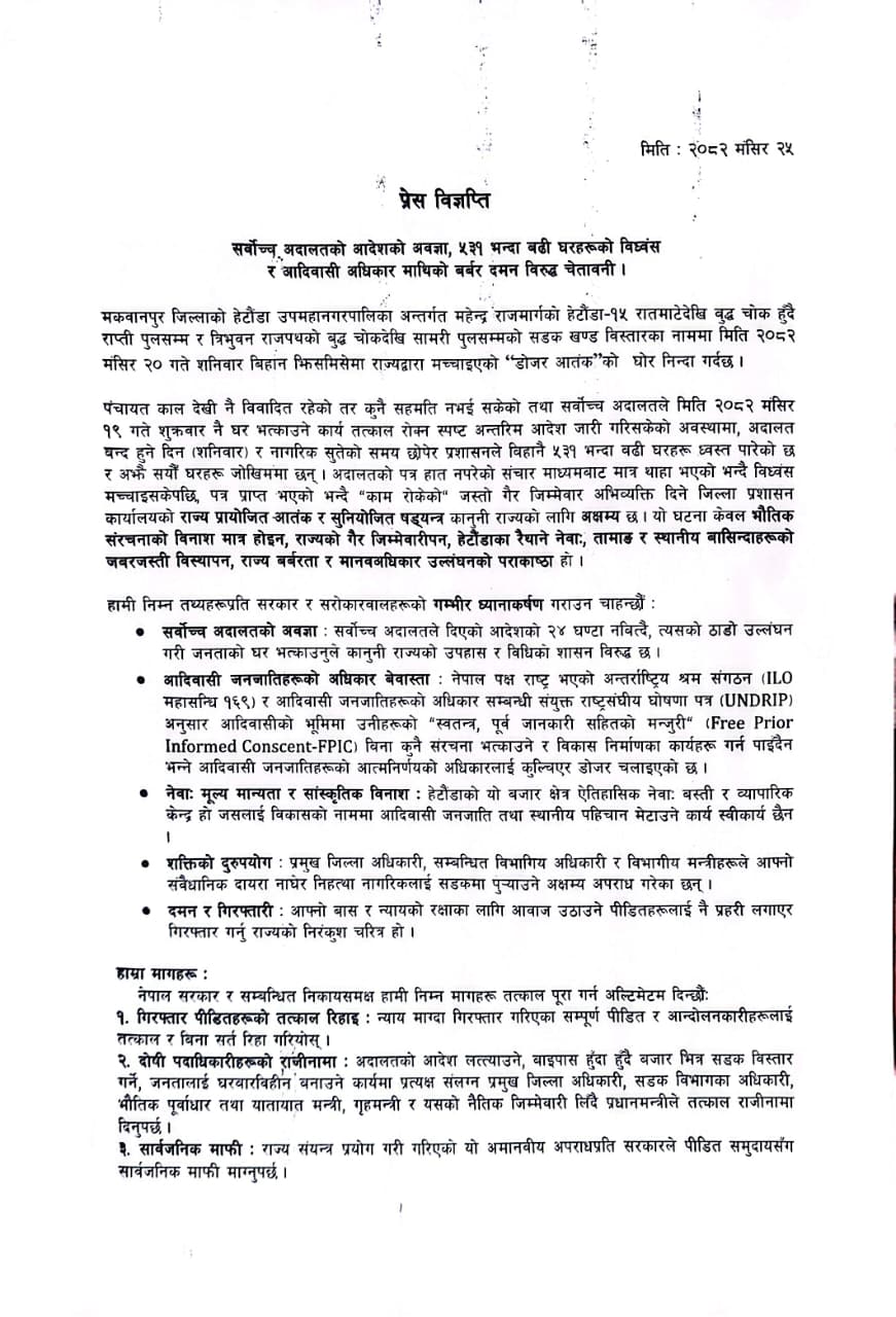 सर्वोच्च अदालतको आदेशको अवज्ञा गरी मकवानपुरको हेटौँडामा ५३१ भन्दा बढी घरहरूमा गरिएको विध्वंस र आदिवासी तथा स्थानीय बासिन्दामाथि गरिएको दमनका विरुद्ध काठमाडौंमा एक संयुक्त पत्रकार सम्मेलन सम्पन्न भएको छ ।