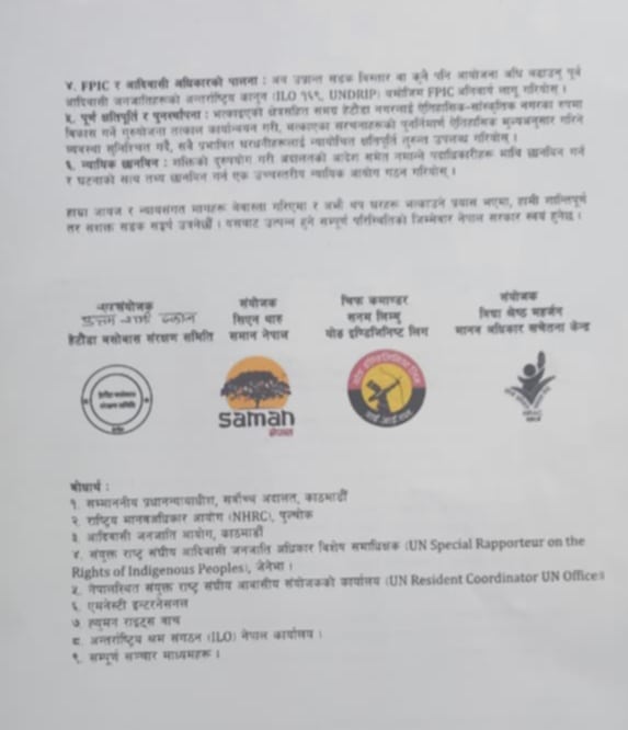 प्रेस विज्ञप्तिमामार्फत सरकारलाई ६ बुँदे माग राखेको छ । गिरफ्तार सबै पीडितको तत्काल रिहाइ गर्नुपर्ने, घटनाका लागि जिम्मेवार पदाधिकारीहरूको राजीनामा हुनुपर्ने—विशेषगरी प्रमुख जिल्ला अधिकारी, सडक विभागका अधिकारी, भौतिक पूर्वाधार तथा यातायात मन्त्री, गृहमन्त्री र नैतिक जिम्मेवारीस्वरूप प्रधानमन्त्रीले समेत राजीनामा दिनुपर्ने, राज्यले सार्वजनिक माफी माग्नुपर्ने, आदिवासी जनजातिको अधिकार अबमूल्यन हुने गरी सडक विस्तार वा अन्य कुनै आयोजना अघि बढाउँदा अनिवार्य रूपमा आईएलओ १६९ र युएनड्रिप बमोजिम एफपिक लागू गर्नुपर्ने, पूर्ण क्षतिपूर्ति र पुनस्र्थापना सुनिश्चित गर्नुपर्ने, र घटनाको न्यायिक छानबिन गर्नुपर्ने लगायत रहेको छ ।
